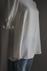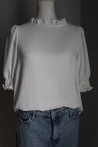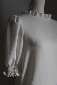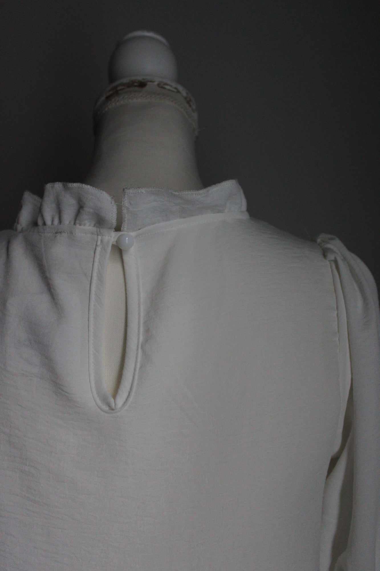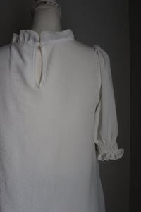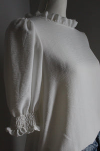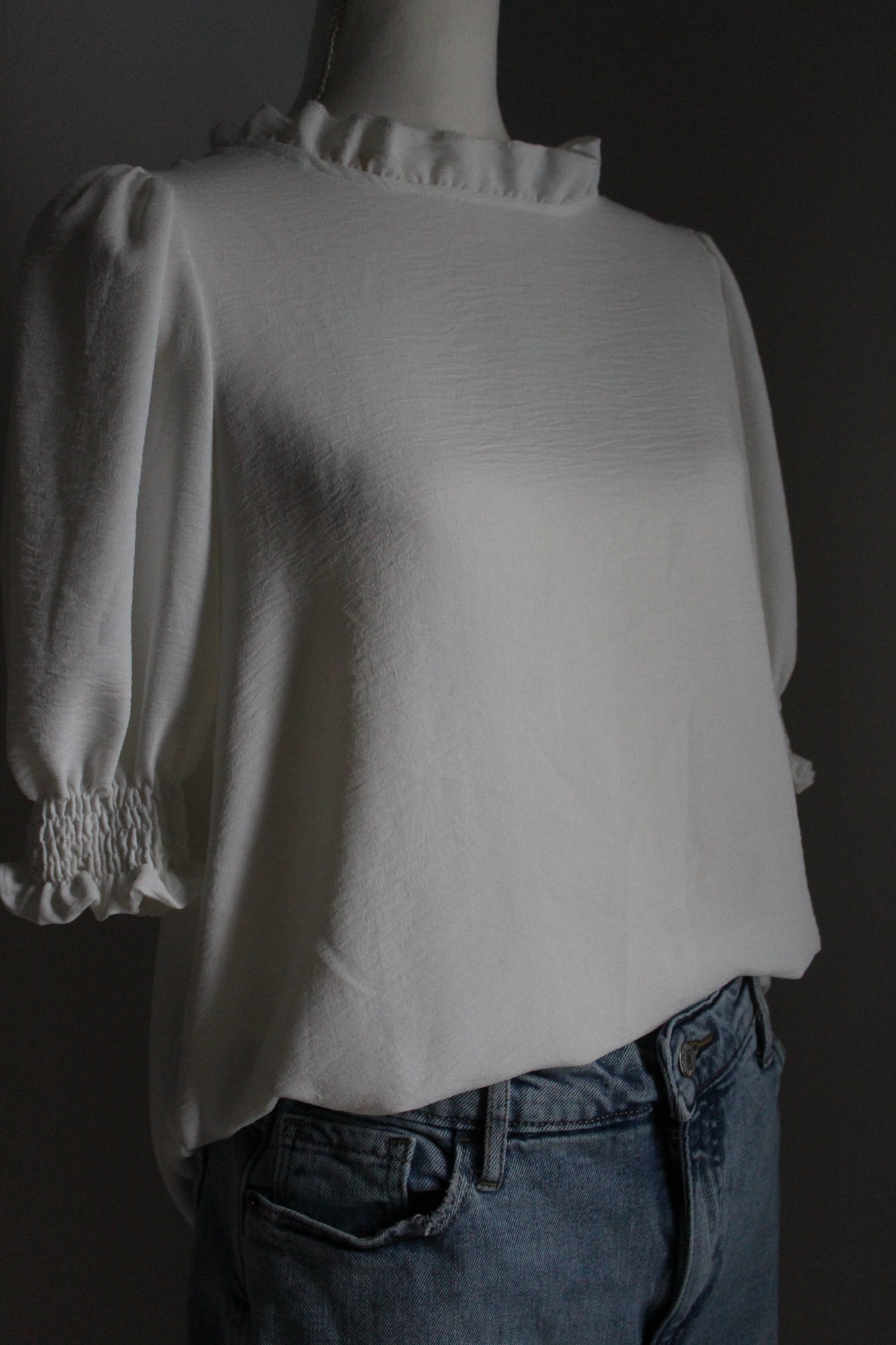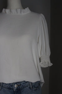 The Charlotte Blouse is the definition of understated elegance. With its soft ivory fabric, delicate ruffle neckline, and smocked ruffle sleeves, this top brings a touch of romance to your everyday style. Designed with a relaxed fit and back button keyhole closure, it’s easy to wear tucked into denim or paired with tailored trousers for a polished look.