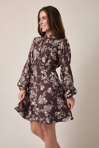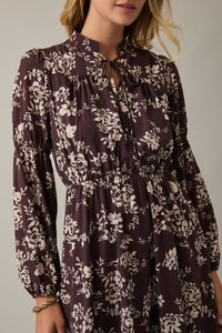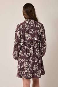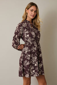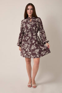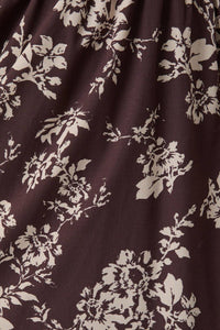 The elastic waist creates a flattering silhouette while allowing plenty of movement, and the mocha-plum floral print adds a warm depth that pairs beautifully with booties and cardigans. Whether you’re heading to brunch, a fall event, or an everyday outing, this dress delivers an effortlessly polished look.