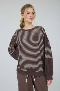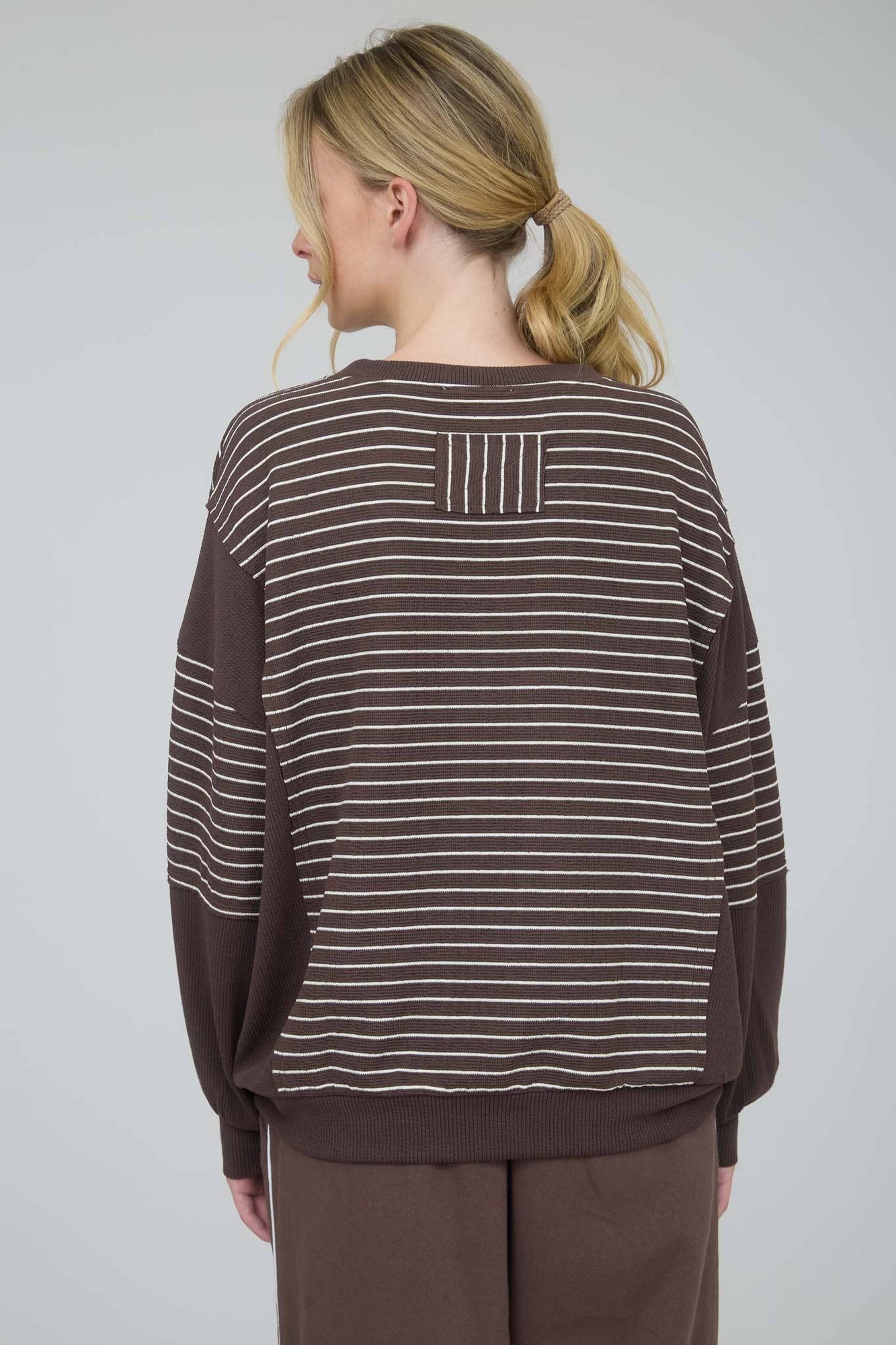 Cozy, casual, and perfectly slouchy, this striped knit top is your new everyday favorite. It features a round neckline, drop shoulders, and long sleeves with subtle patchwork contrast detailing for that effortlessly elevated look. The soft knit fabric and relaxed fit make it ideal for pairing with denim, joggers, or leggings — the ultimate throw-on-and-go piece for fall.