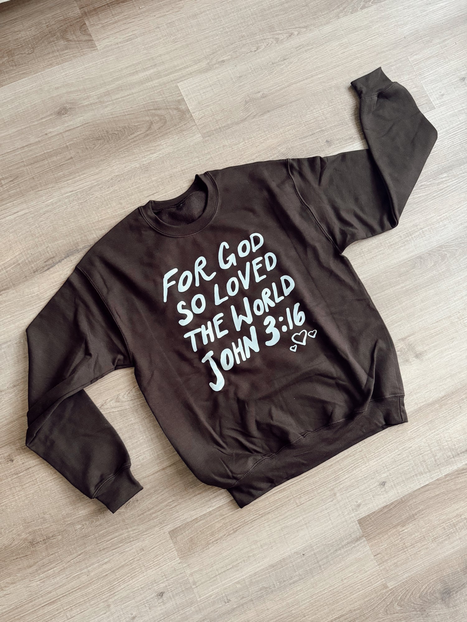 Wrap yourself in this sweet reminder of the greatest love story. This rich mocha-brown crewneck pairs a soft, lived-in feel with a bold handwritten-style graphic that reads “For God so loved the world – John 3:16.” Heart doodles add the cutest touch for everyday encouragement.