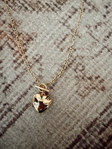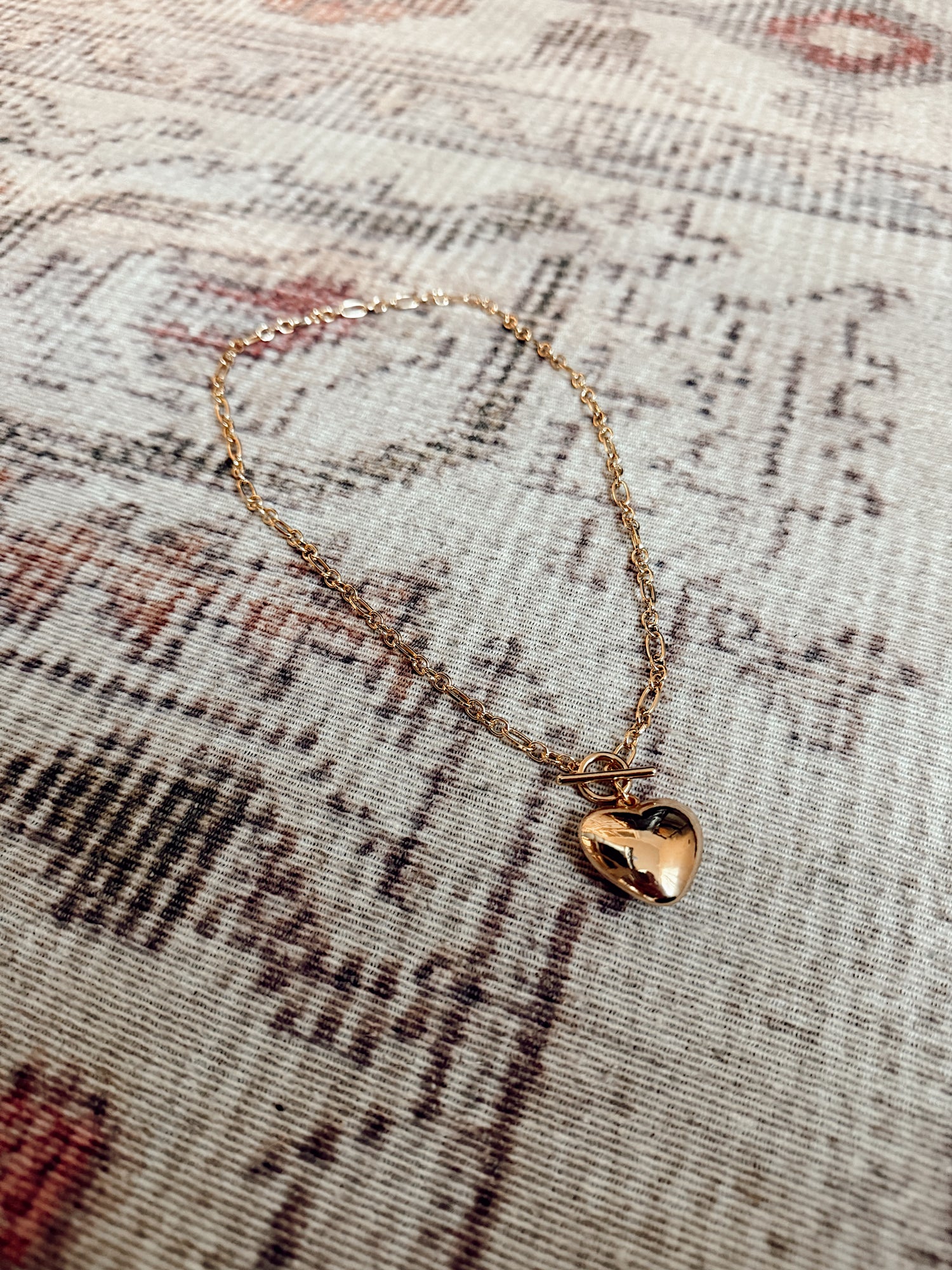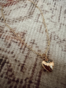 Simple, chic, and effortlessly romantic — this puff heart toggle necklace features a shiny gold heart pendant suspended from a classic paperclip-style chain. The toggle closure adds a modern, elevated touch while keeping the look clean and timeless.